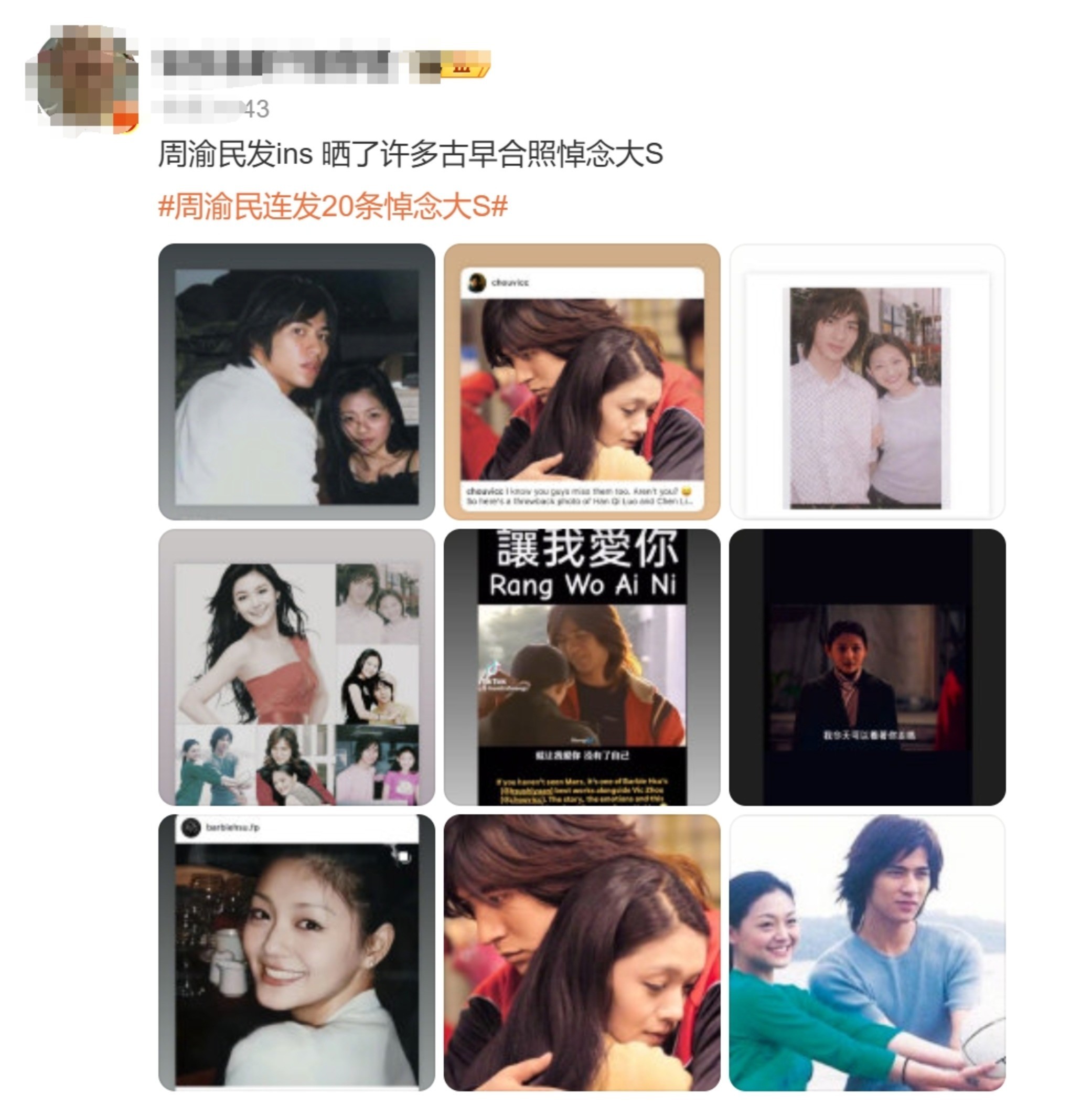 2月4日,网传周渝民沉默1天后,在社交平台连发多条动态悼念大S,还晒出过去两人在《流星花园》及《战神》的剧照,“永远不会忘记这份很棒的爱,会永远想念”。